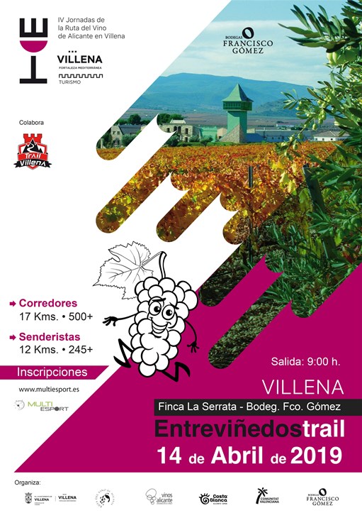 La Carrera entre Viñedos, domingo 14 de abril, está enmarcada dentro de las acciones promocionales del turismo enológico de Villena con Enotur. Tiene dos modalidades, una de trail para corredores de montaña con una distancia de 17 kilómetros y 500 metros de desnivel positivo. Además existe una prueba de senderismo de 12 kilómetros de distancia y 245 metros de desnivel positivo. Ambas tienen un recorrido circular con comienzo y final en la explanada de la Bodega Francisco Gómez.